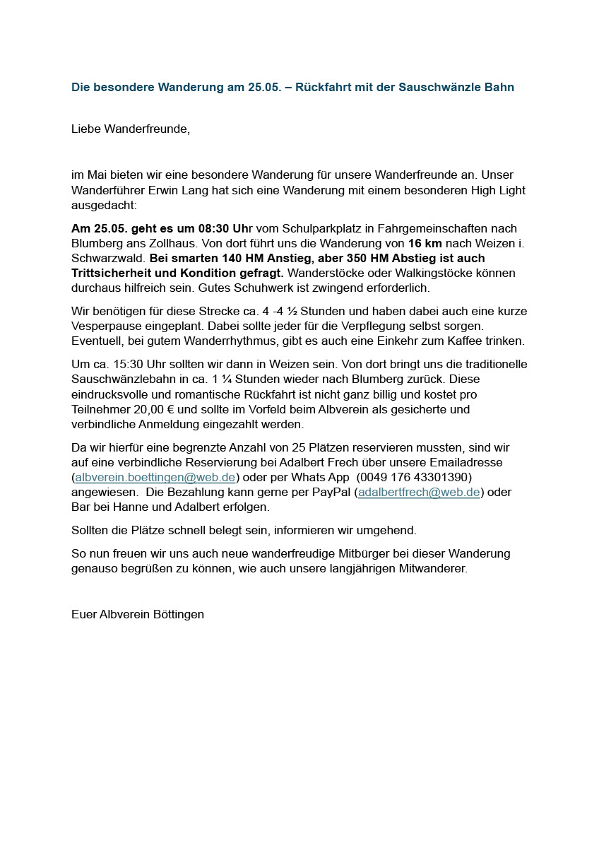 Zu dieser Veranstaltung ist eine verbindliche Anmeldung erforderlich, da die Sitzplätze in der Sauschwänzlebahn reserviert werden müssen. Wanderführer ist Erwin Lang