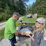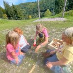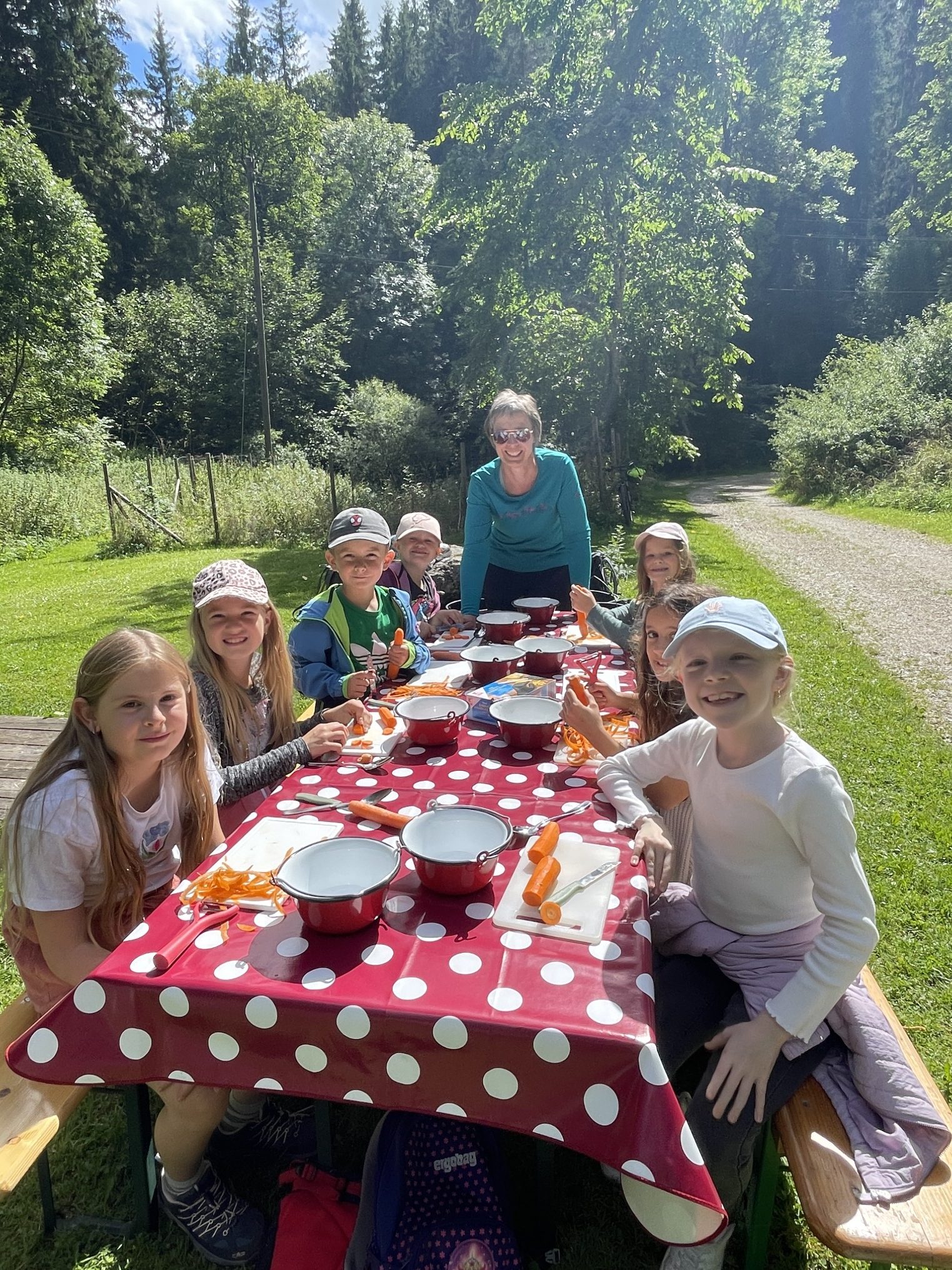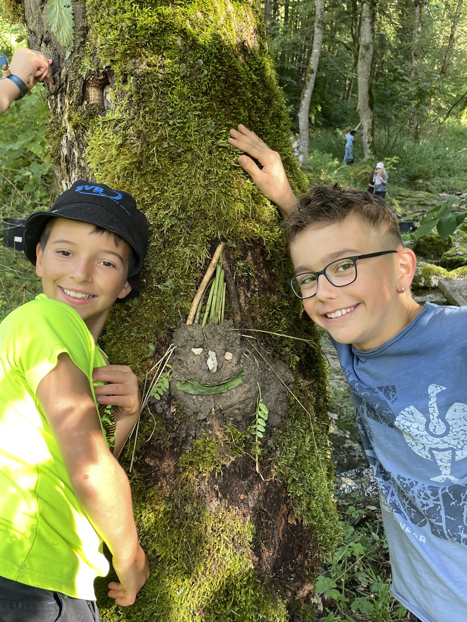 Bei idealem Wetter durften die Helfer des Albvereins 15 Kinder zum diesjährigen Ferienprogramm begrüßen. Vom Treffpunkt am Skilift ging es in einer gemütlichen Wanderung zur Grillstelle am Schäferbrunnen. Dort angekommen wurden das Gemüse und die Toppings für den Eintopf mit Feuereifer geschält und geschnippelt. Während dieser im Hexenkessel über dem offenen Feuer der Grillstelle schmorte, ging es für die kleinen Köche nahtlos weiter. Auch beim nächsten Programmpunkt drehte sich im weitesten Sinn ums Zubereiten – nicht von Speisen, sondern von Matsch! Ausgestattet mit Eimer und Schaufel galt es aus Sand, Humus und Wasser die richtige Konsistenz zu mischen, um Matschgesichter an Baumstämmen oder Felsen zu gestalten. Der Kreativität waren keine Grenzen gesetzt und so entstanden überraschende Ergebnisse. Nach dem Verspeisen des Hexenkessel-Eintopfs durfte als Nachtisch das mittlerweile legendäre Grillstellen-Popcorn nicht fehlen. Über das Kreuzensteigle ging es für die Teilnehmer anschließend wieder zurück nach Böttingen. Vielen Dank an die Helfer Hanne & Adalbert Frech, Kathrin & Thomas Ziegler sowie Simone Lehr und natürlich auch an den Wettergott, der für ein paar Stunden das Wasser abgestellt hat.